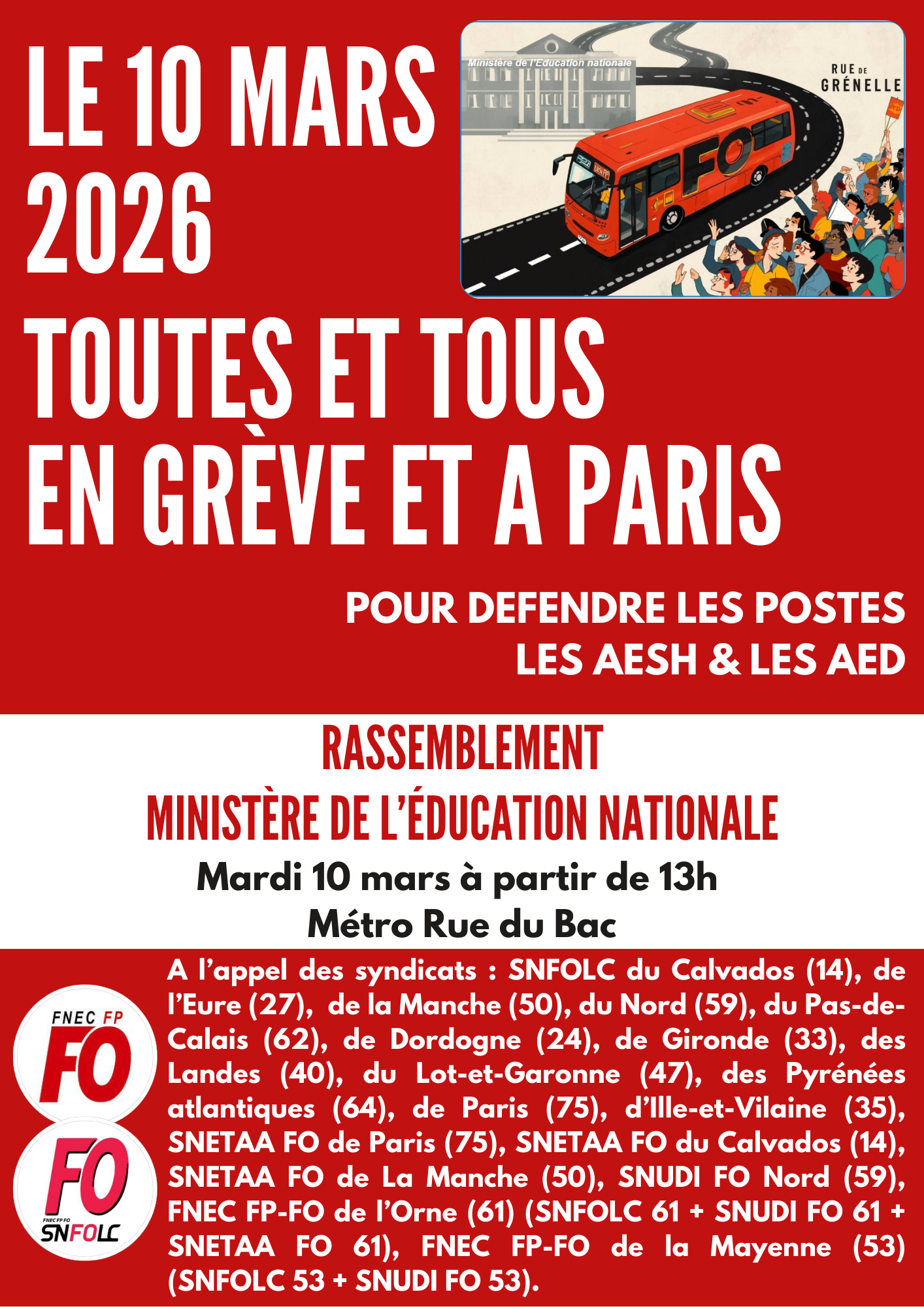 Les syndicats SNFOLC de l’Eure (27) et de la Manche (50) (académie de Normandie), du Pas-de-Calais (62) et du Nord (59) (académie de Lille), de Dordogne (24), de Gironde (33), des Landes (40) et des Pyrénées atlantiques (64) (académie de Bordeaux), le SNFOLC d’Ille-et-Vilaine (35) (académie de Rennes), la FNEC FP-FO de L’Orne (61) et (...)