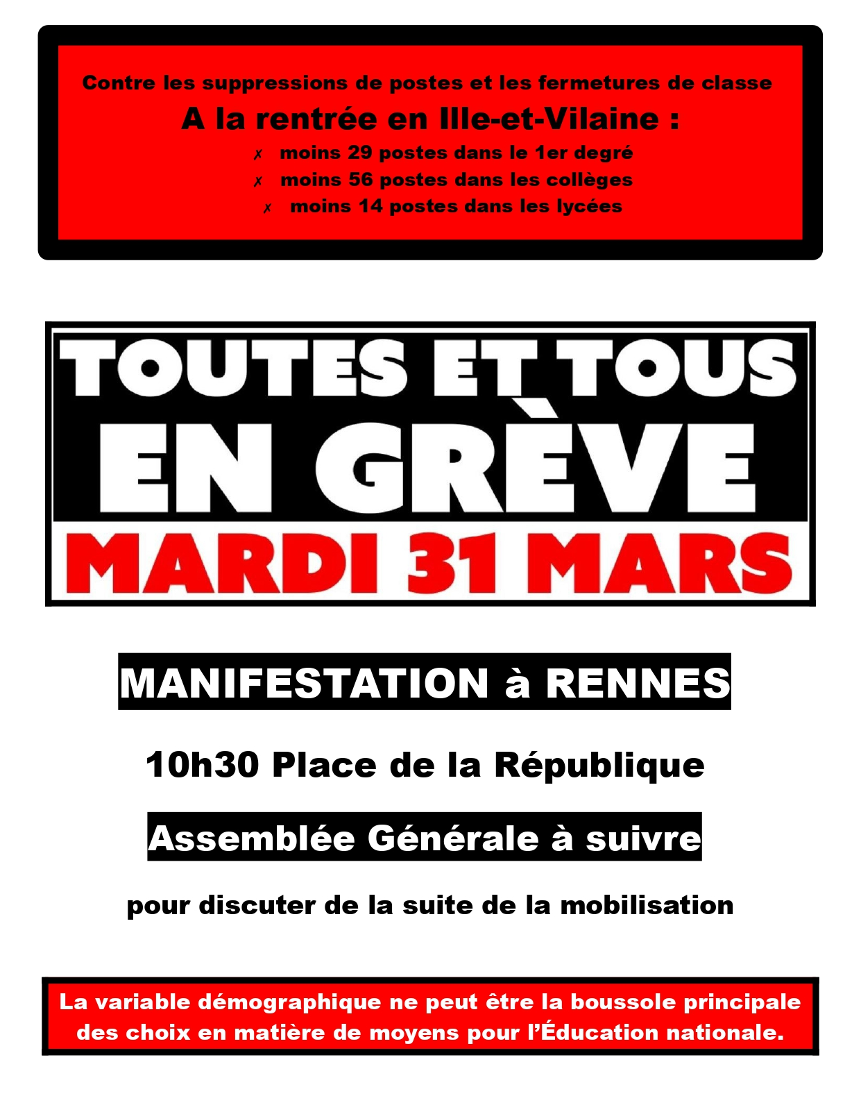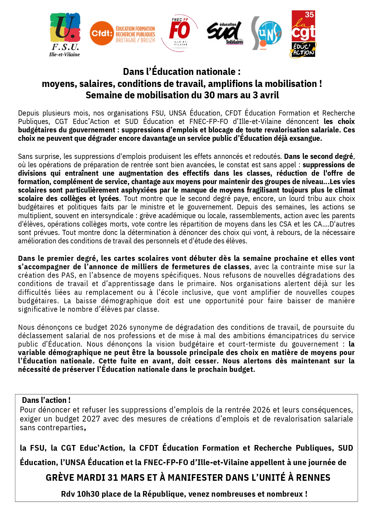 FO 35 appelle à durcir la mobilisation : après la montée nationale le 10 mars, après la grève du jeudi 19 mars, après le rassemblement devant la DSDEN le mercredi 25 mars, après la grève du jeudi 26 mars… La bataille contre les fermetures de postes est loin d’être terminée !