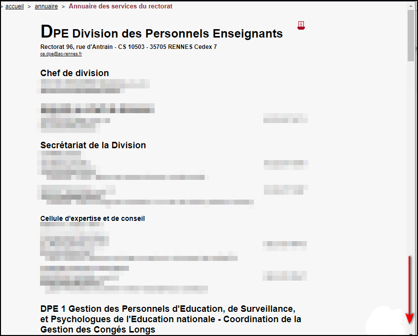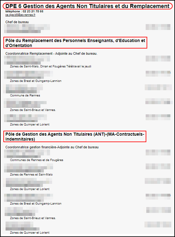 Descendez jusqu’à DPE 6 pour les services concernant les contractuels et veillez à contacter la personne en fonction de son pôle et de sa zone.