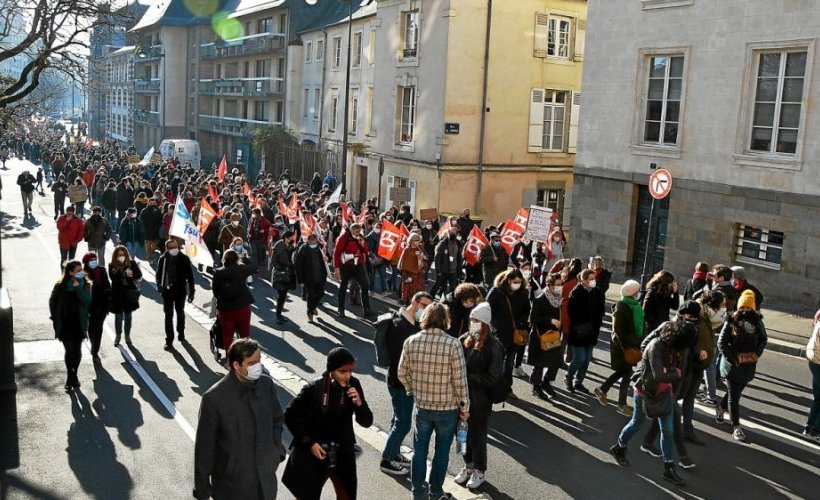 Nous étions 3 000 manifestants dans les rues de Rennes aujourd’hui : des lycéens, des étudiants, des infirmières, des assistantes maternelles, des parents, des personnels de vie scolaire, des AESH, des enseignant(e)s, des personnels administratifs… Un public très large.