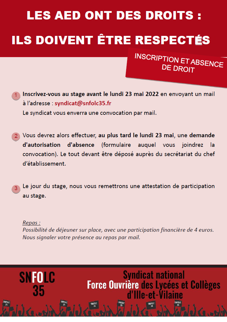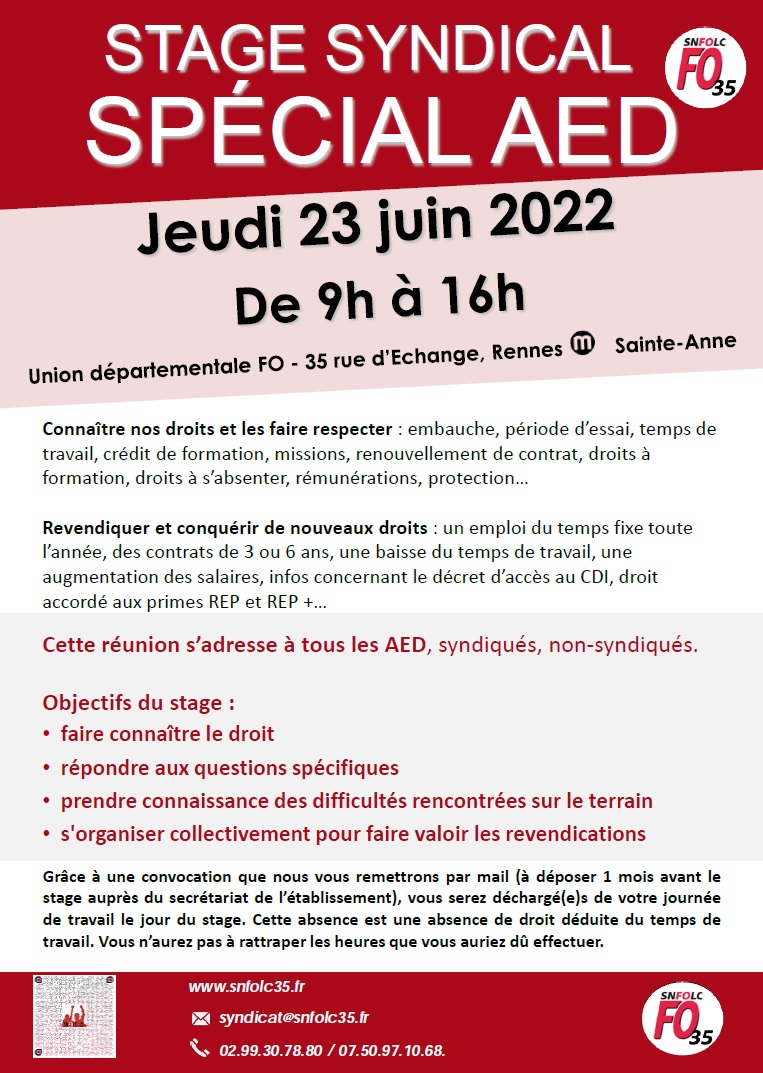 Publié le 12/05/202212/05/2022 Stage syndical pour les AED jeudi 23 juin 2022 Les inscriptions sont ouvertes jusqu’au lundi 23 mai! Contactez-nous!