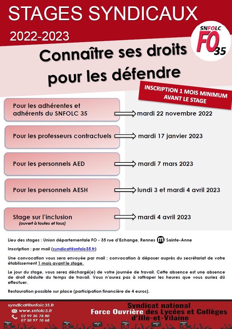 Publié le 06/09/202222/09/2022 Programmation de nos stages syndicaux 2022-2023 Inscription 1 mois avant le stage ! Pour télécharger le document : c’est ici !
