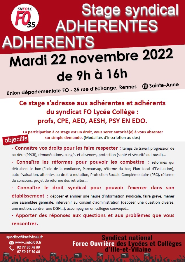 Stage syndical réservé aux adhérentes et adhérents du SNFOLC 35!