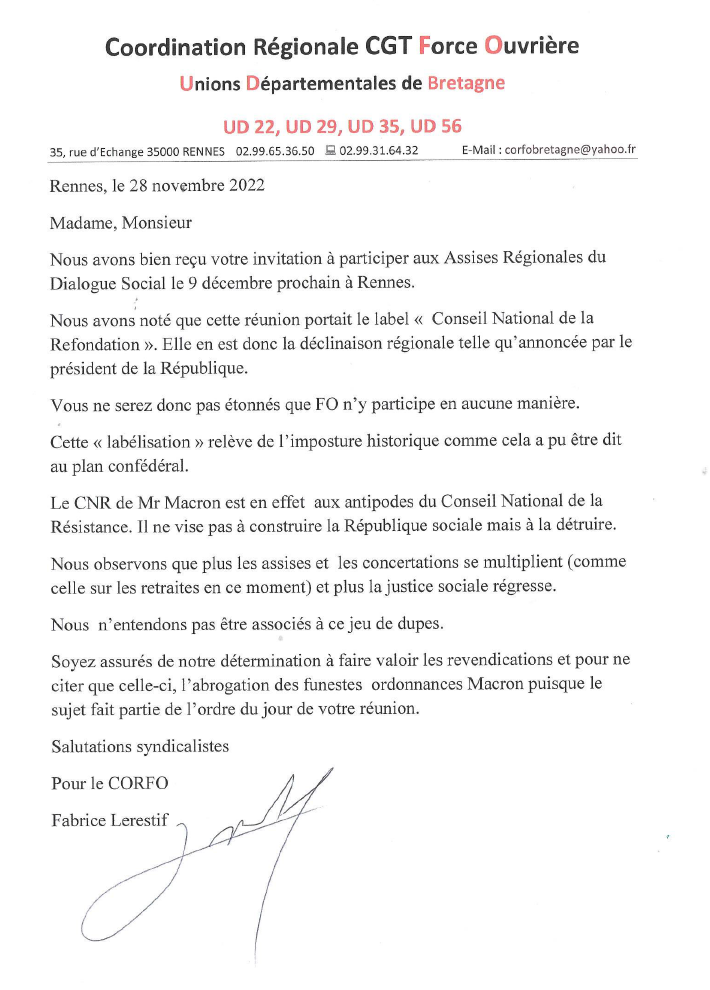 Aucune UD FO de Bretagne ne participera à ces assises.