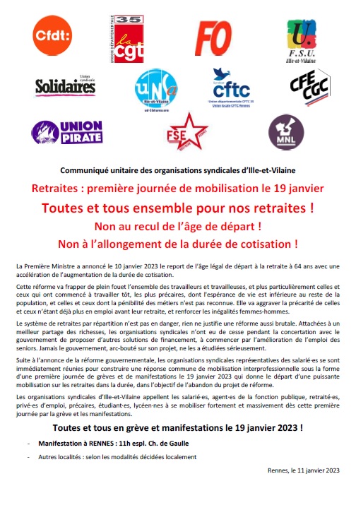 Publié le 11/01/202313/01/2023 Communiqué unitaire 35 sur les Retraites : première journée de mobilisation le 19 janvier Pour télécharger le tract : C’est ici.