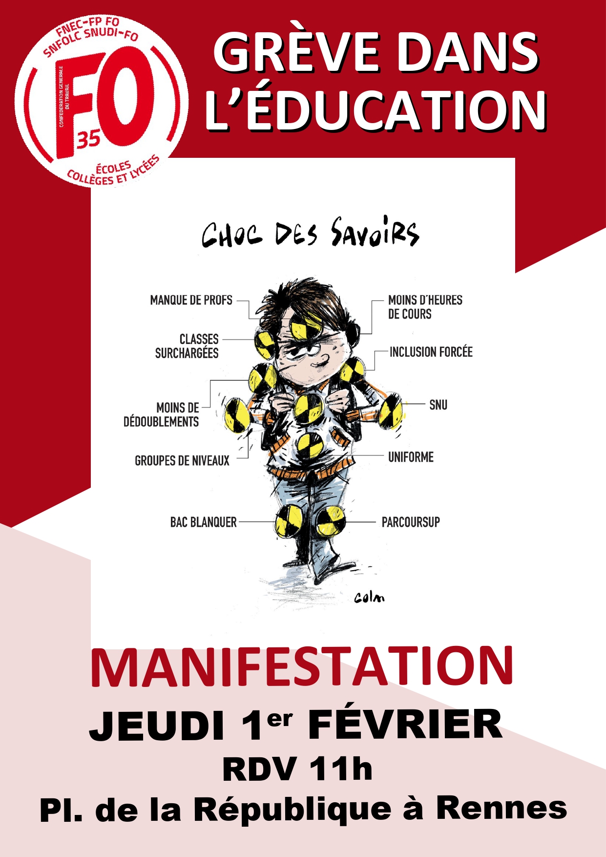 Pour nos salaires, contre les suppressions de postes, contre la mise en place des réformes à marche forcée, nos organisations syndicales FSU, FNEC FP – FO, CGT Educ’Action, SUD éducation appellent à une action de grèves et des manifestations le 1er février 2024.