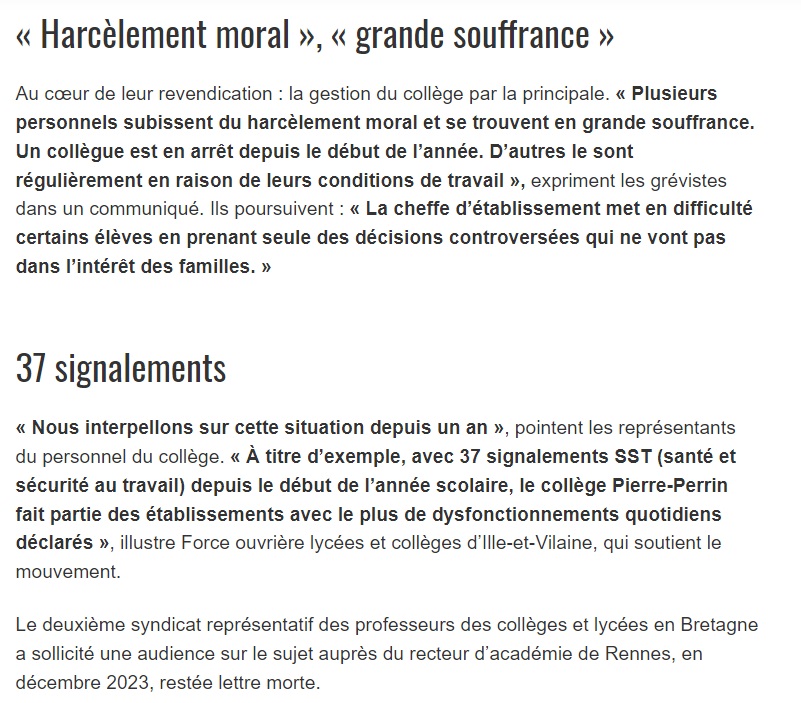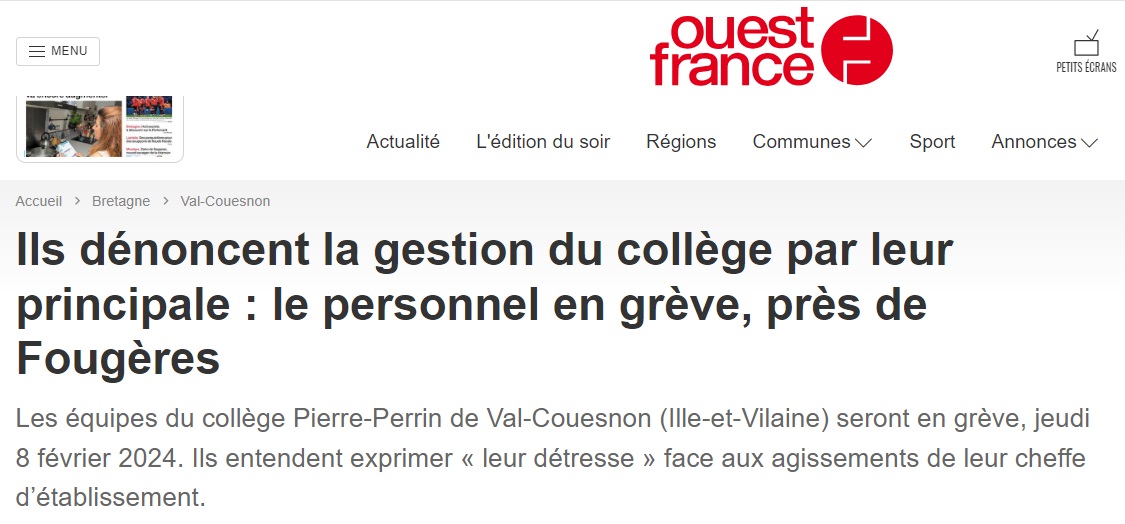 Publié le 07/02/202407/02/2024 Mobilisation au collège Pierre Perrin contre la maltraitance des personnels Lien pour lire l’article sur Ouest-France : ici.