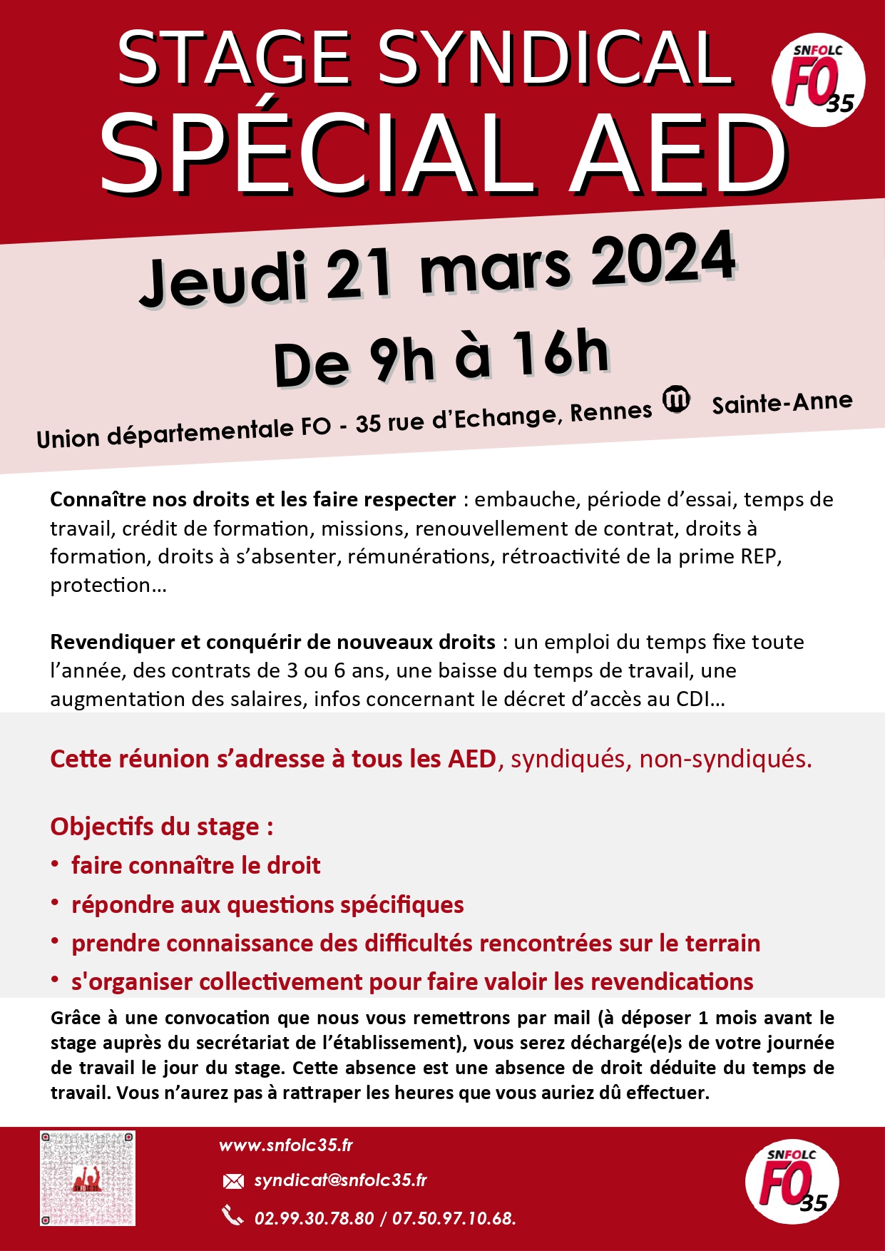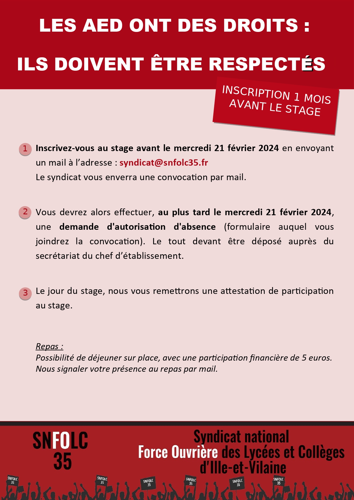 Stage syndical pour les AED : jeudi 21 mars 2024