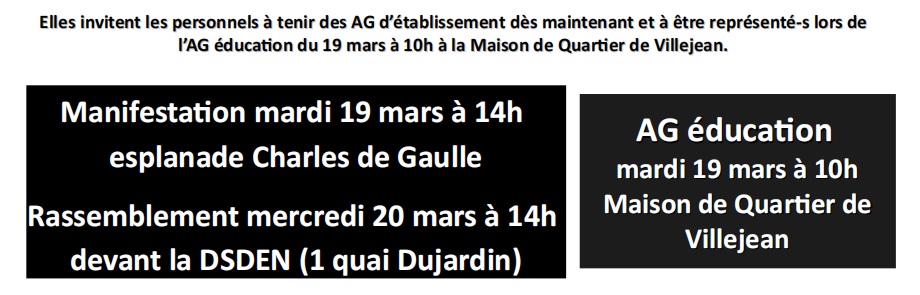 Parce que la journée du 19 mars doit être le point de départ d’une mobilisation forte, et que les personnels doivent discuter de la reconduction de la grève dès le 20 mars…