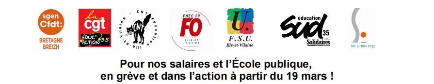 Pour mettre un terme à l’affaissement du pouvoir d’achat des agents, aux rémunération indigne de nombreux agents de catégorie C, des AESH, des AED et de nombreux agents contractuels et refuser de subir une année blanche en termes d’augmentation de traitement, nos organisations FNEC FP FO 35, FSU, UNSA Éducation, SGEN-CFDT, CGT Educ’action, SUD éducation, CNT-STE appellent à la grève et à la mobilisation par tous les moyens à partir du 19 mars.