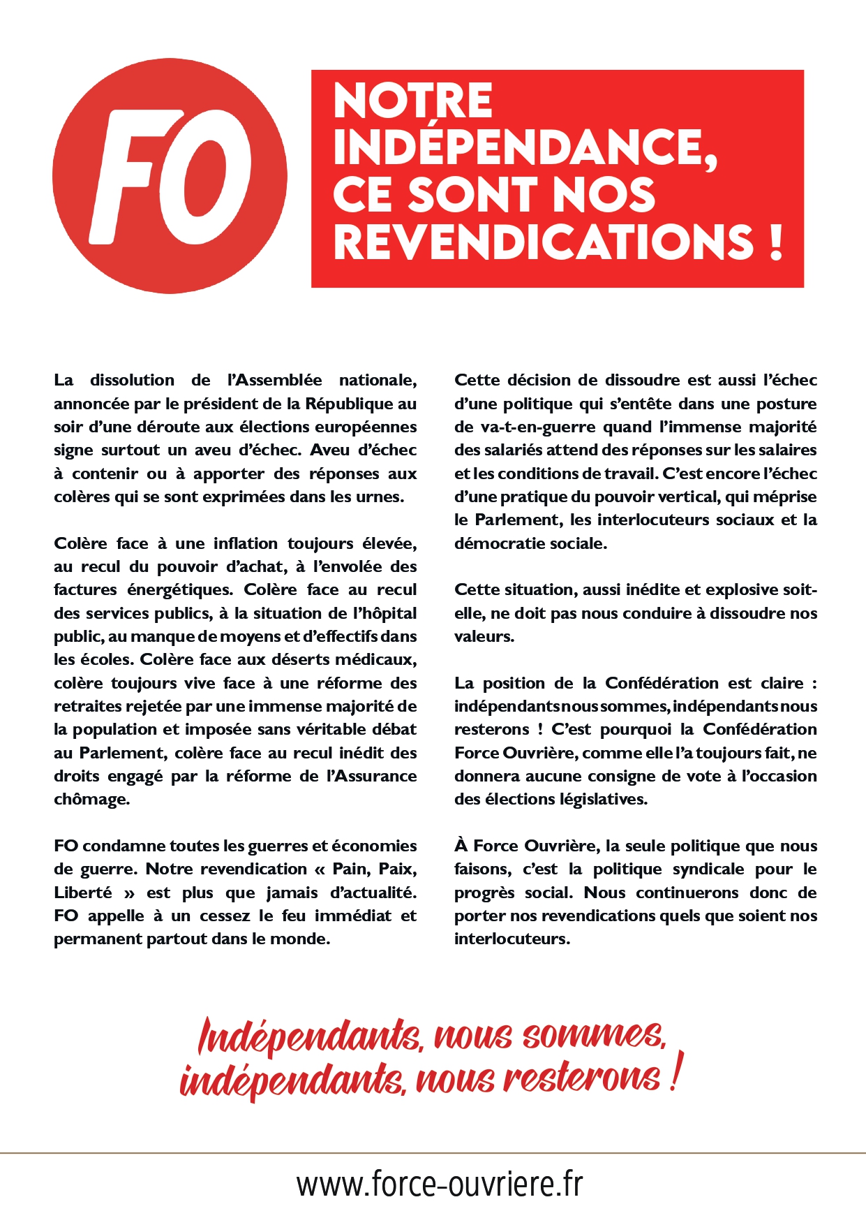 Cette situation, aussi inédite et explosive soit-elle, ne doit pas nous conduire à dissoudre nos valeurs. La position de la Confédération est claire : indépendants nous sommes, indépendants nous resterons ! C’est pourquoi la Confédération Force Ouvrière, comme elle l’a toujours fait, ne donnera aucune consigne de vote à l’occasion des élections législatives.