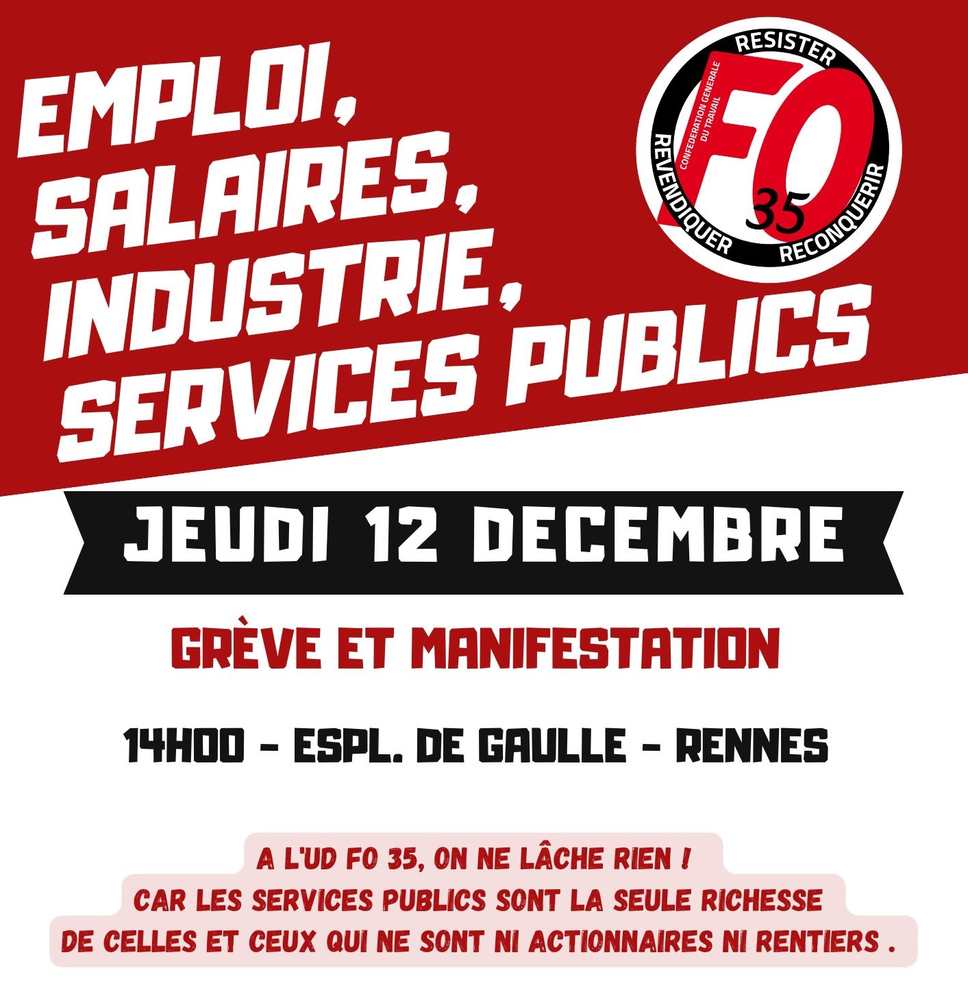 Ainsi , ce jeudi 12 décembre à 14H esplanade de Gaulle à Rennes, manifestation intersyndicale contre les plans de licenciements, pour la défense des services publics !