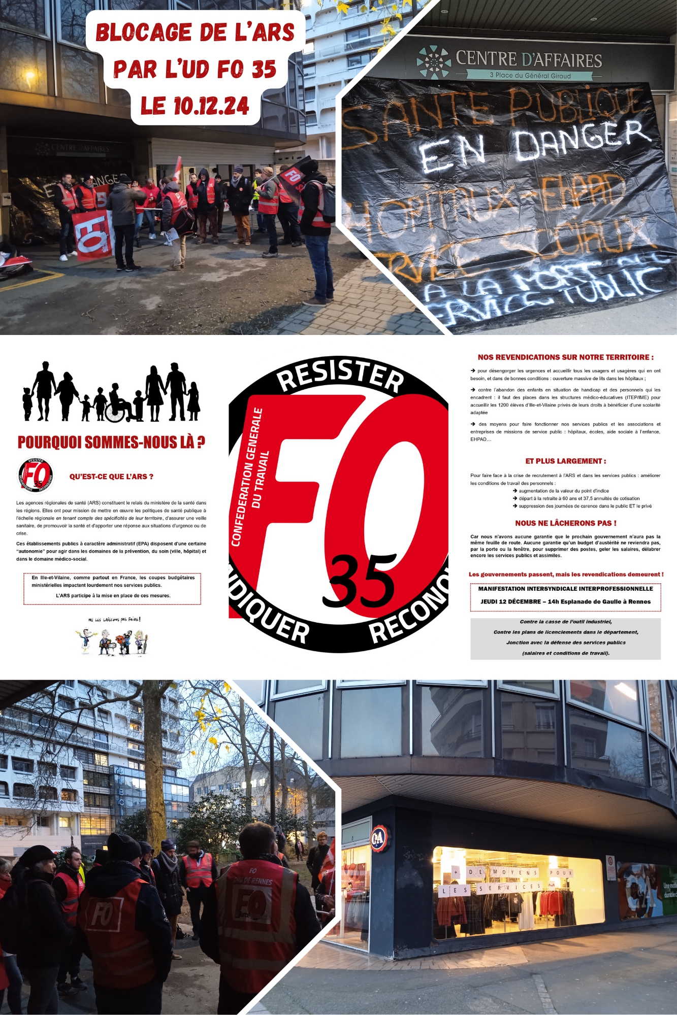 Mardi 10 décembre dès 7h30, une bonne trentaine de militantes et militants FO ont bloqué la porte de l’Agence Régionale de Santé à Rennes pour exiger des moyens pour les Hôpitaux, les EHPAD , les structures médico-éducatives …