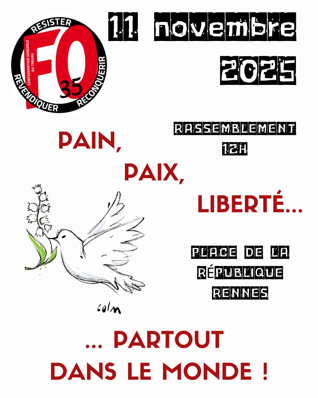 Force ouvrière organise un rassemblement mardi prochain 11 novembre à 12h place de la république à Rennes.