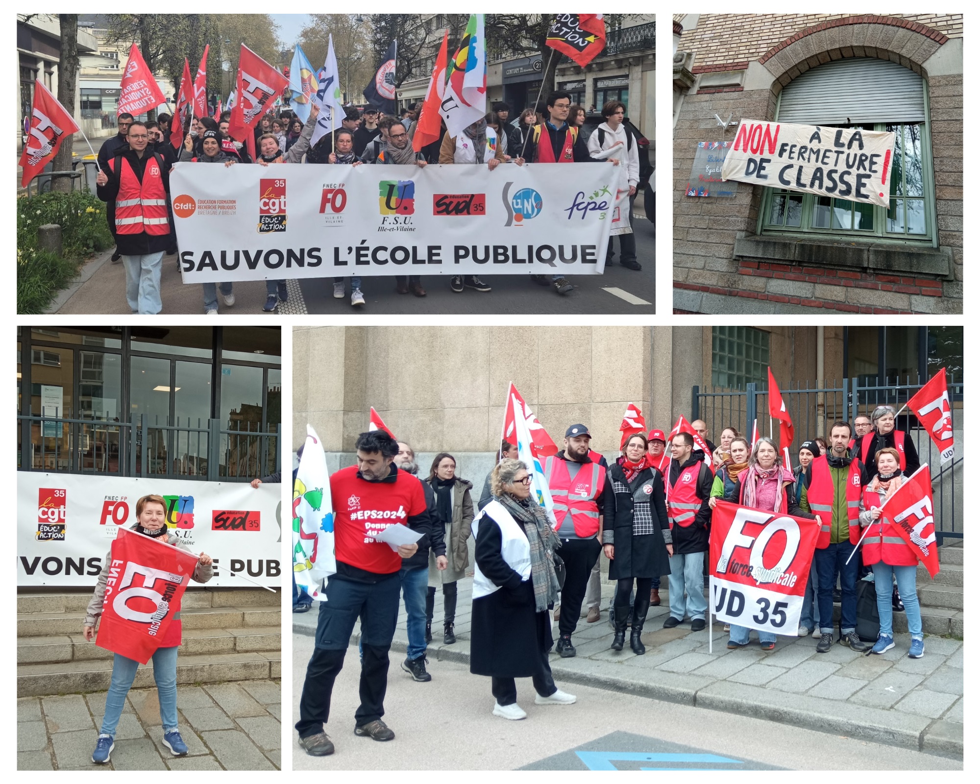 Aujourd’hui mardi 31 mars en Ille-et-Vilaine, à l’appel des organisations syndicales SNFOLC 35, SNUDI FO 35, CGT, SUD, FSU, UNSA, CFDT, FSU, nous étions plus de 1 000 manifestantes et manifestants à battre le pavé dans les rues de Rennes pour demander l’annulation de toutes les suppressions de postes et fermetures de classes.