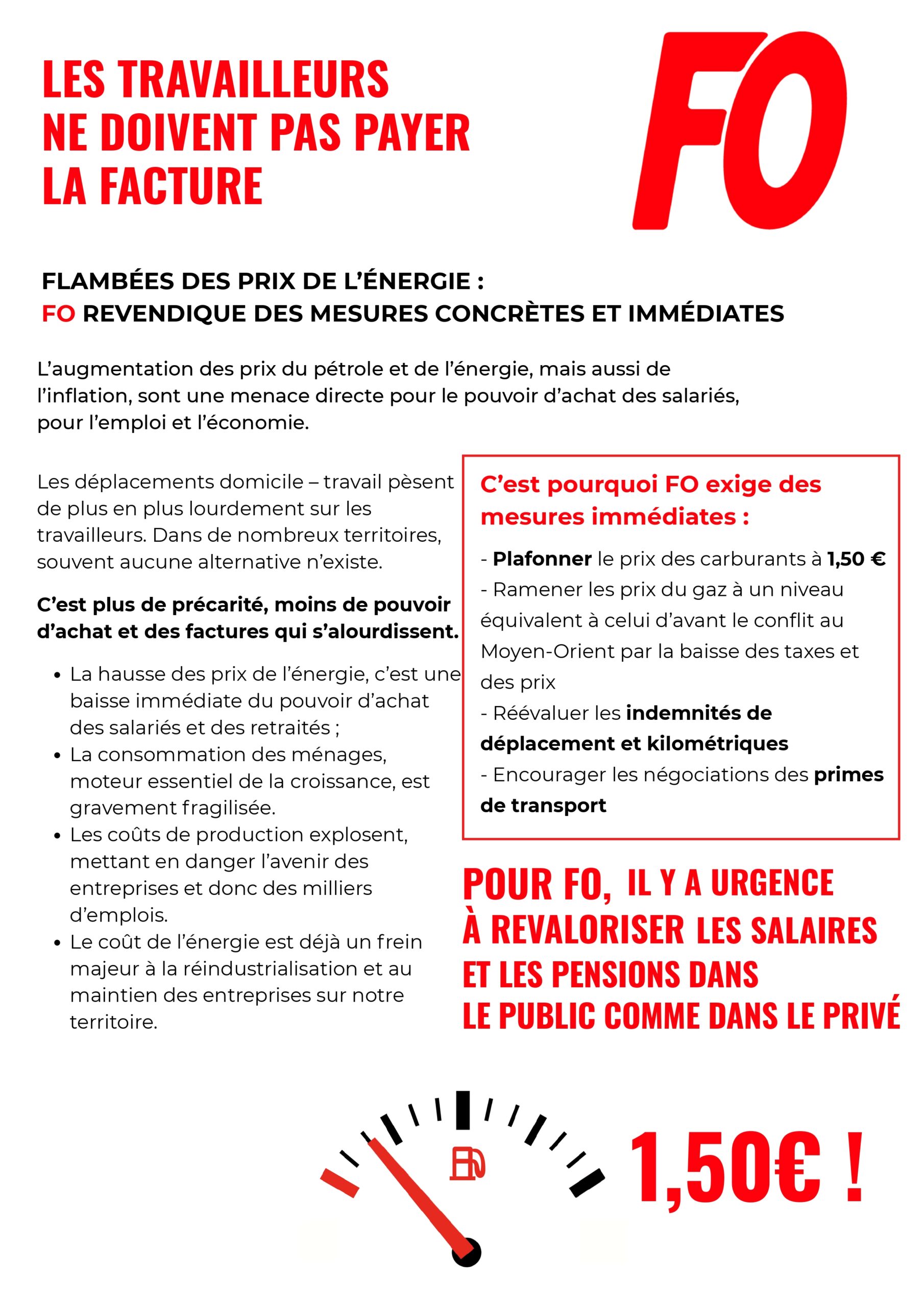 La confédération Force ouvrière, les fédérations de la Fonction Publique et la FNEC FP FO se sont adressés au Ministre pour demander le plafonnement des prix des carburants, l’augmentation des salaires, la revalorisation de l’ISSR et des frais de déplacement.