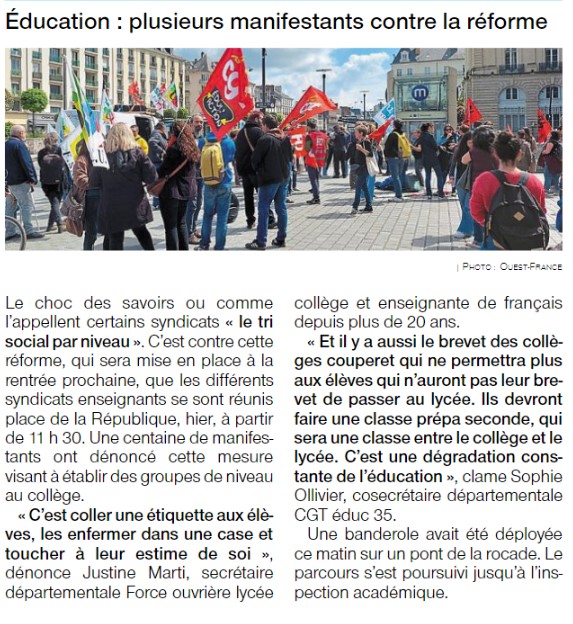 Soutenus par la fédération des parents d’élèves la FCPE 35 et la totalité des organisations syndicales (la CGT Educ’action 35, la CNT, la FNEC FP-FO 35, la FSU 35, le SGEN CFDT Bretagne, SUD Éducation 35, le SE-UNSA), nous avons exprimé de manière unanime notre opposition à la réforme, tant sur le fond que sur la mise en œuvre.