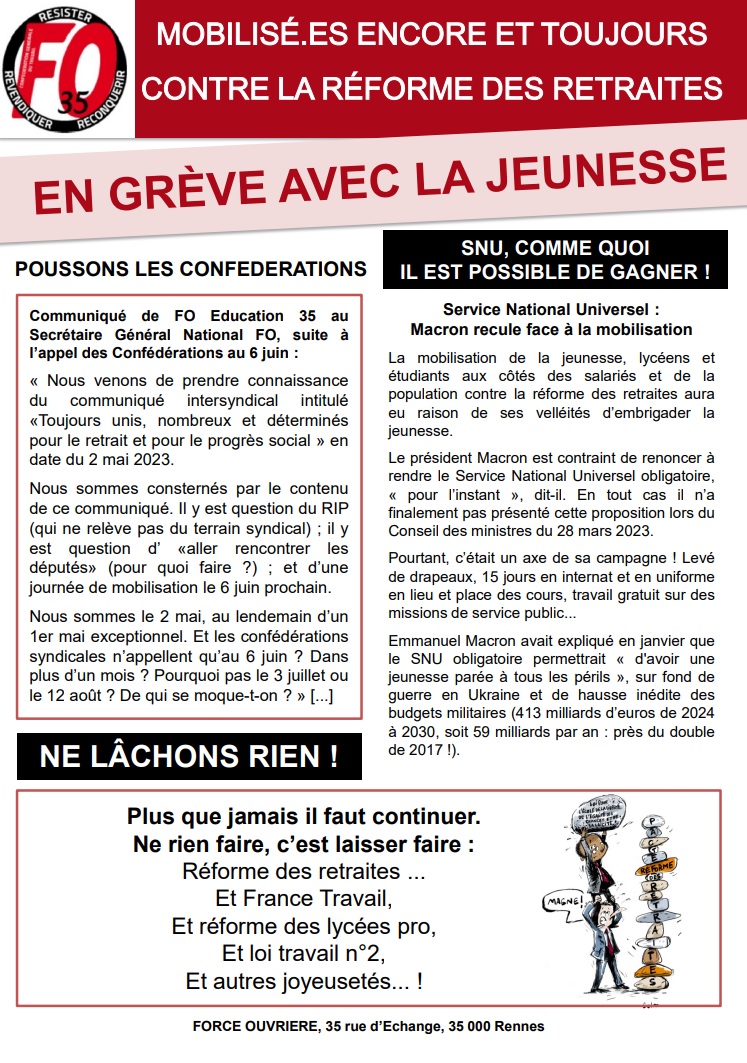 Jeudi 11 mai, la jeunesse syndicale et politique rennaise a défilé dans les rues pour continuer la lutte… car le 6 juin (date fixée par les confédérations syndicales pour la prochaine mobilisation contre la réforme des retraites), c’est trop loin !
