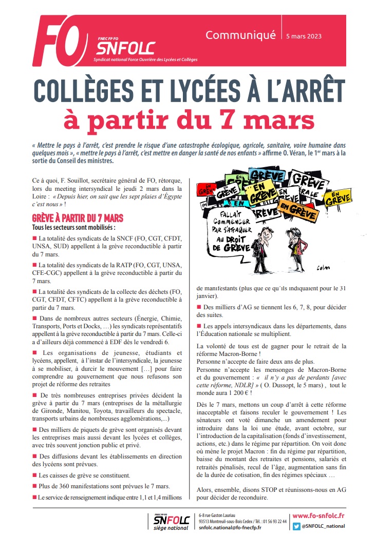 – la totalité des syndicats de la SNCF (FO, CGT, CFDT, UNSA, SUD) appellent à la grève reconductible à partir du 7 mars