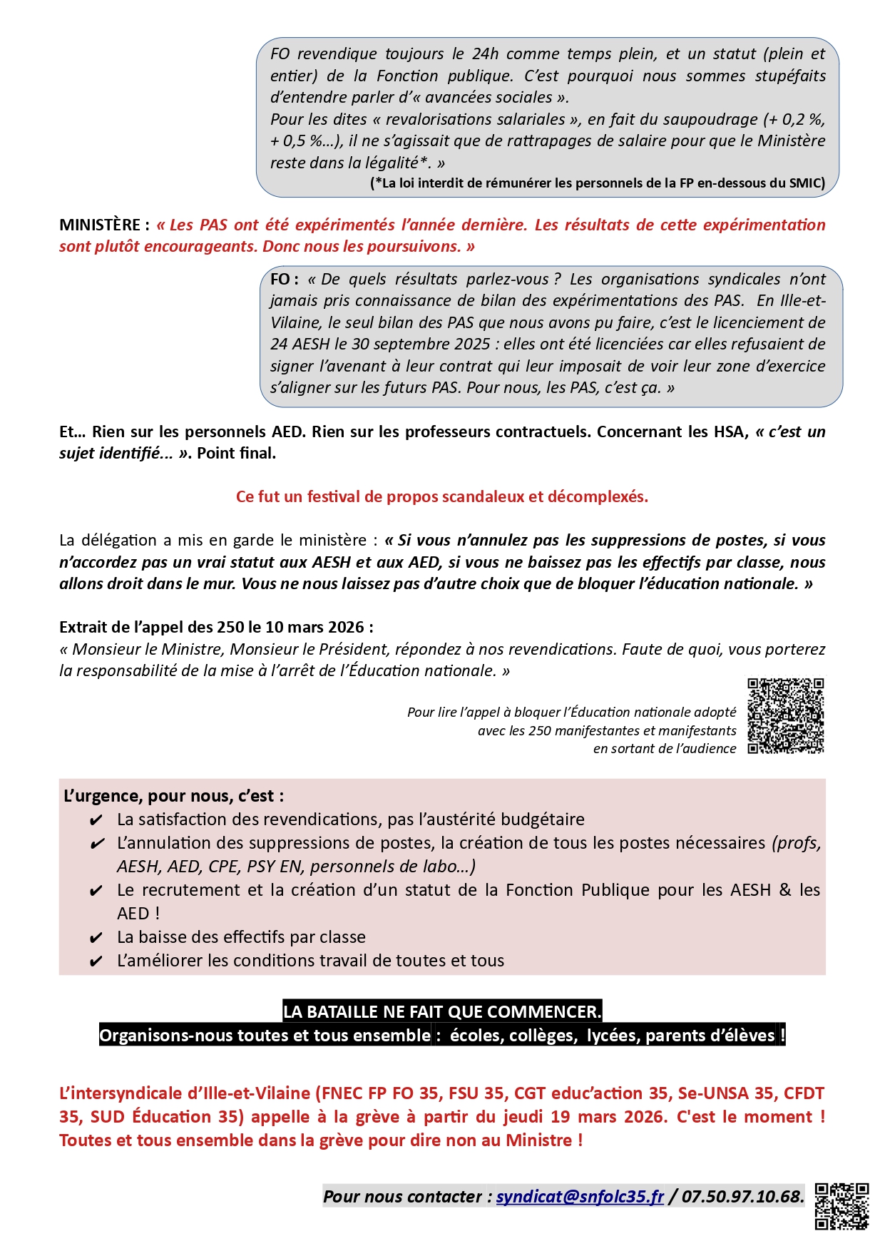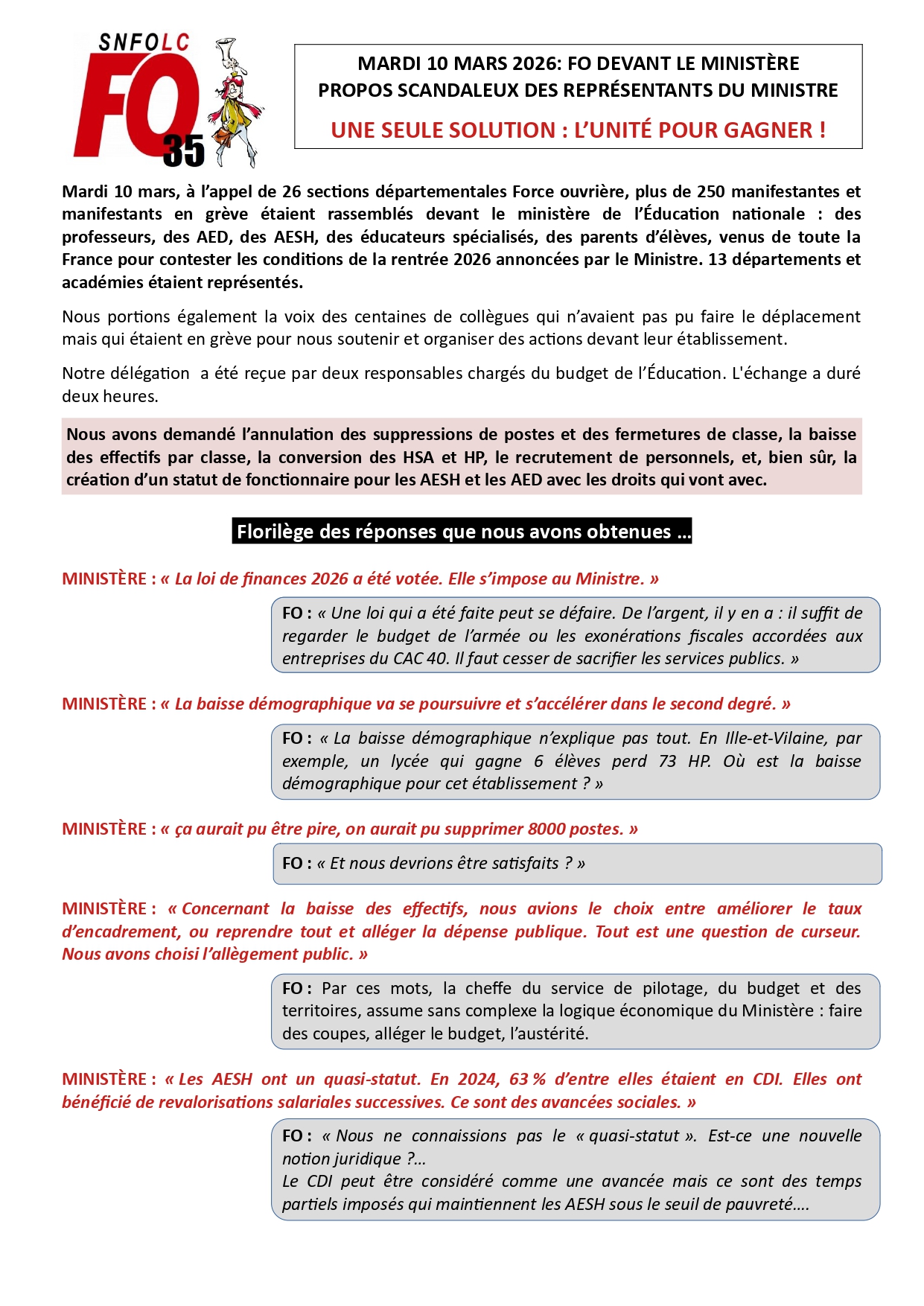 Le SNFOLC 35 appelle à la grève et invite tous les personnels à monter au Ministère à Paris le mardi 10 mars 2026 pour exiger :