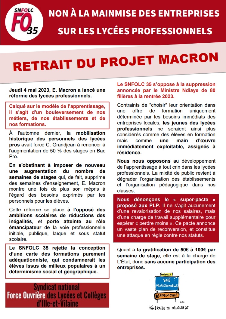 La FNEC FP-FO continuera à défendre le lycée professionnel, les PLP et les jeunes qui nous sont confiés contre ce ministère qui ne cessent de vouloir rendre les personnels responsables du décrochage scolaire, des défauts de l’insertion professionnelle des diplômés.