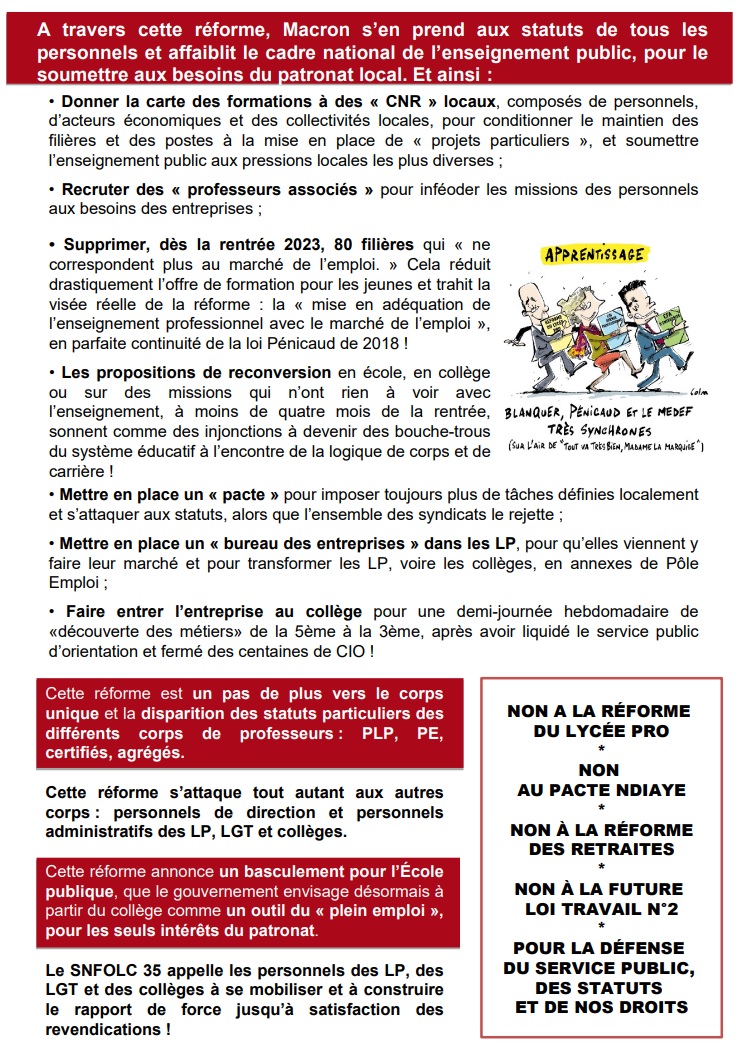Les PLP ne sont pas dupes, ils ont compris l’enfumage de cette réforme qui n’a pour seule finalité que de détruire le LP, faire de l’apprentissage l’alpha et l’oméga de la formation professionnelle et, à coups de millions, privatiser l’enseignement professionnel.